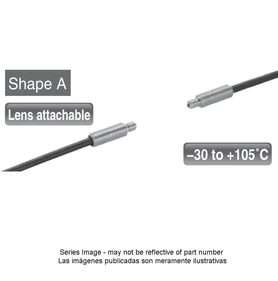 Sensores e interruptores fotoeléctricos - Fibra óptica - Unidades de fibra - Resistente al calor, Thru Scan - Recto, lente de forma A acoplable, temperatura de funcionamiento de -22 °F (-30 °C) a 221 °F (105 °C), radio de curvatura del cable R25, longitud del cable de 2 m con corte libre, elemento Ø 1,0, tamaño mínimo detectable Ø 0,005. La distancia de detección dependerá del amplificador utilizado. Consulte las especificaciones en la sección de documentos.